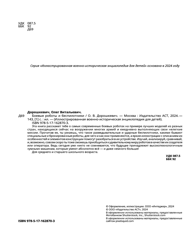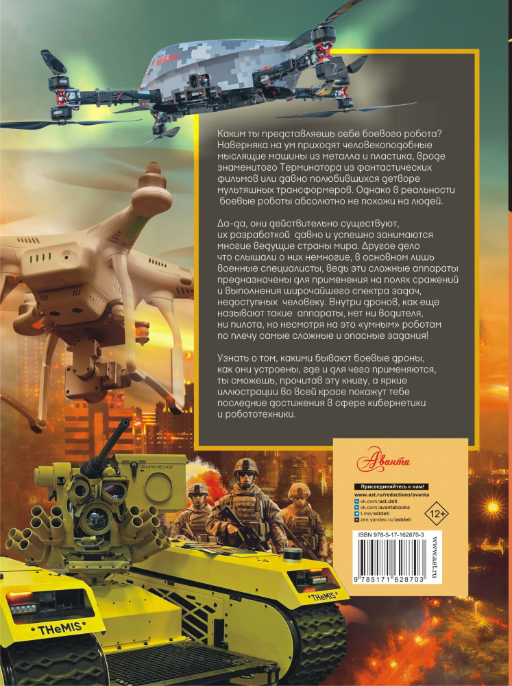 💳 Оплатить за товар можно при получении 🇰🇿 Есть бесплатная доставка по Казахстану от 1 дня 🎁 Копите бонусы с каждой покупки Серия: Иллюстрированная военно-историческая энциклопедия для детей Эта книга расскажет тебе о самых современных боевых роботах на примере лучших моделей из разных стран, находящихся сейчас на вооружении многих армий и ежедневно выполняющих свои нелегкие миссии. Прочитав ее, ты узнаешь, что такое разведывательные и ударные беспилотники, какими бывают специальные и бронированные роботы, для чего и как они применяются, а яркие иллюстрации с описанием их особенностей и элементов конструкции помогут разобраться в их устройстве. Изучай, анализируй, сравнивай, и, возможно, совсем скоро ты тоже сможешь приобщиться к удивительному миру роботов в качестве их создателя или оператора. Ведь сегодня уже никто не сомневается, что будущее принадлежит высокотехнологичным «умным» машинам, которые умеют абсолютно всё — и даже немного больше! |