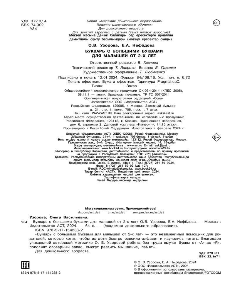 Букварь с большими буквами для малышей от 2 летОльга Васильевна Узорова, Елена Алексеевна Нефедова В данный момент этот товар отсутствует в продаже. Возможно, у нас найдется аналогичный или похожий товар здесь. Серия: Академия дошкольного образования «Букварь с большими буквами для малышей от 2 лет» — это незаменимый помощник для родителей, которые хотят, чтобы их дети быстро освоили алфавит и научились читать. Благодаря уникальной авторской методике О. В. Узоровой ребята без труда выучат буквы от «А» до «Я», пополнят словарный запас, смогут развить мышление, память. |