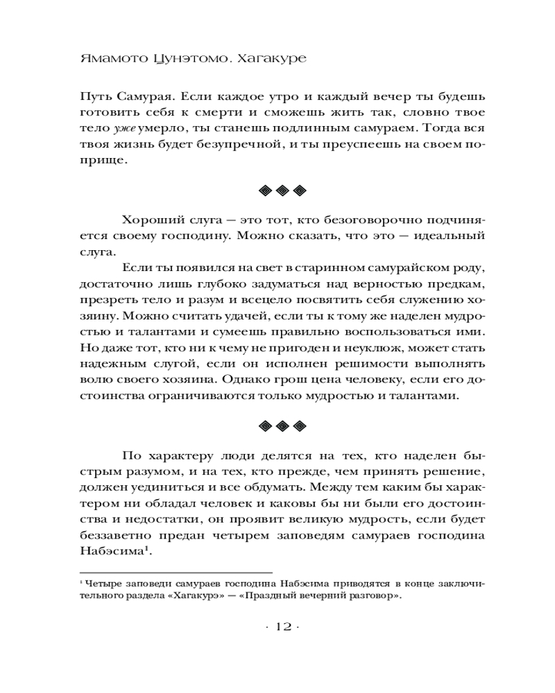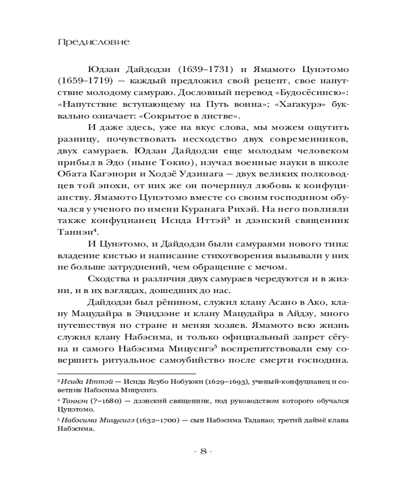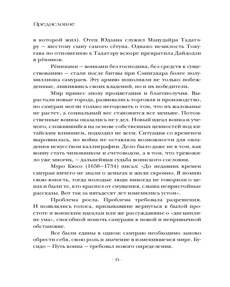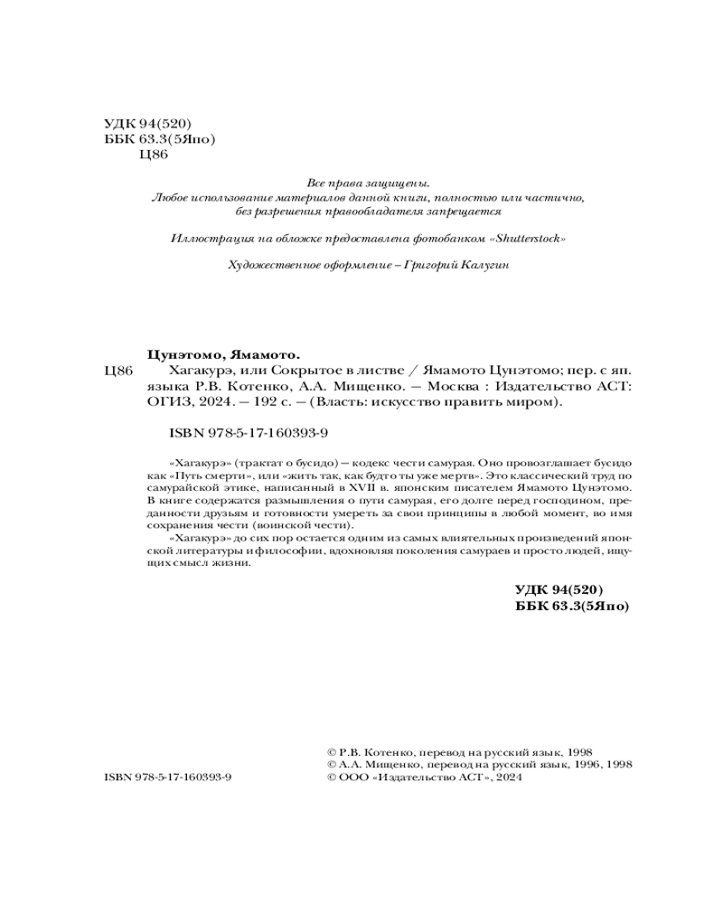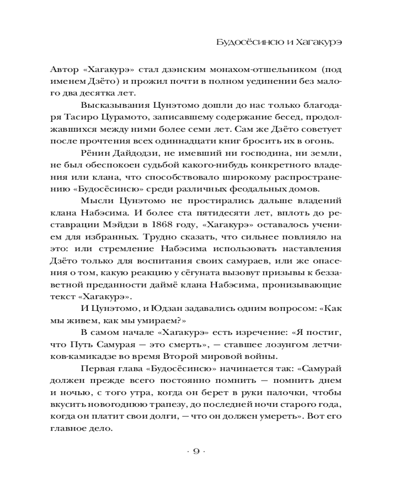 💳 Оплатить за товар можно при получении 🇰🇿 Есть бесплатная доставка по Казахстану от 1 дня 🎁 Копите бонусы с каждой покупки Серия: Власть: искусство править миром «Хагакурэ» (трактат о бусидо) — кодекс чести самурая. Он провозглашает бусидо как «Путь смерти», или «жить так, как будто ты уже мертв». Это классический труд по самурайской этике, написанный в XVII в. японским писателем Ямамото Цунэтомо. В книге содержатся размышления о пути самурая, его долге перед господином, преданности друзьям и готовности умереть за свои принципы в любой момент, во имя сохранения чести (воинской чести). «Хагакурэ» до сих пор остается одним из самых влиятельных произведений японской литературы и философии, вдохновляя поколения самураев и просто людей, ищущих смысл жизни. |