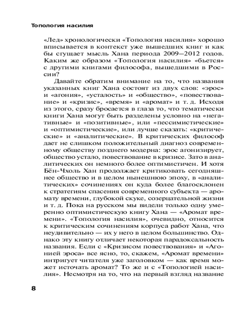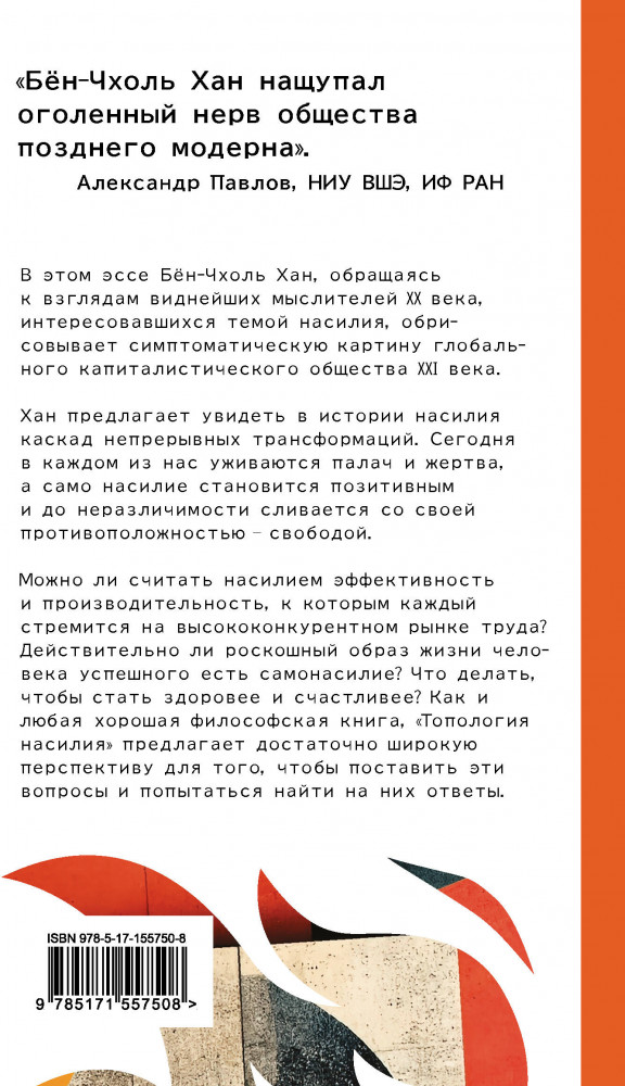 💳 Оплатить за товар можно при получении 🇰🇿 Есть бесплатная доставка по Казахстану от 1 дня 🎁 Копите бонусы с каждой покупки Серия: Smart В этом эссе Бён-Чхоль Хан, обращаясь к взглядам виднейших мыслителей XX века, интересовавшихся темой насилия, обрисовывает симптоматическую картину глобального капиталистического общества XXI века. Хан предлагает увидеть в истории насилия каскад непрерывных трансформаций. Сегодня в каждом из нас уживаются палач и жертва,а само насилие становится позитивным и до неразличимости сливается со своей противоположностью — свободой. Можно ли считать насилием эффективность и производительность, к которым каждый стремится на высококонкурентном рынке труда? Действительно ли роскошный образ жизни человека успешного есть самонасилие? Что делать, чтобы стать здоровее и счастливее? Как и любая хорошая философская книга, «Топология насилия» предлагает достаточно широкую перспективу для того, чтобы поставить эти вопросы и попытаться найти на них ответы. |