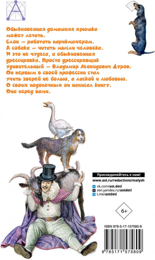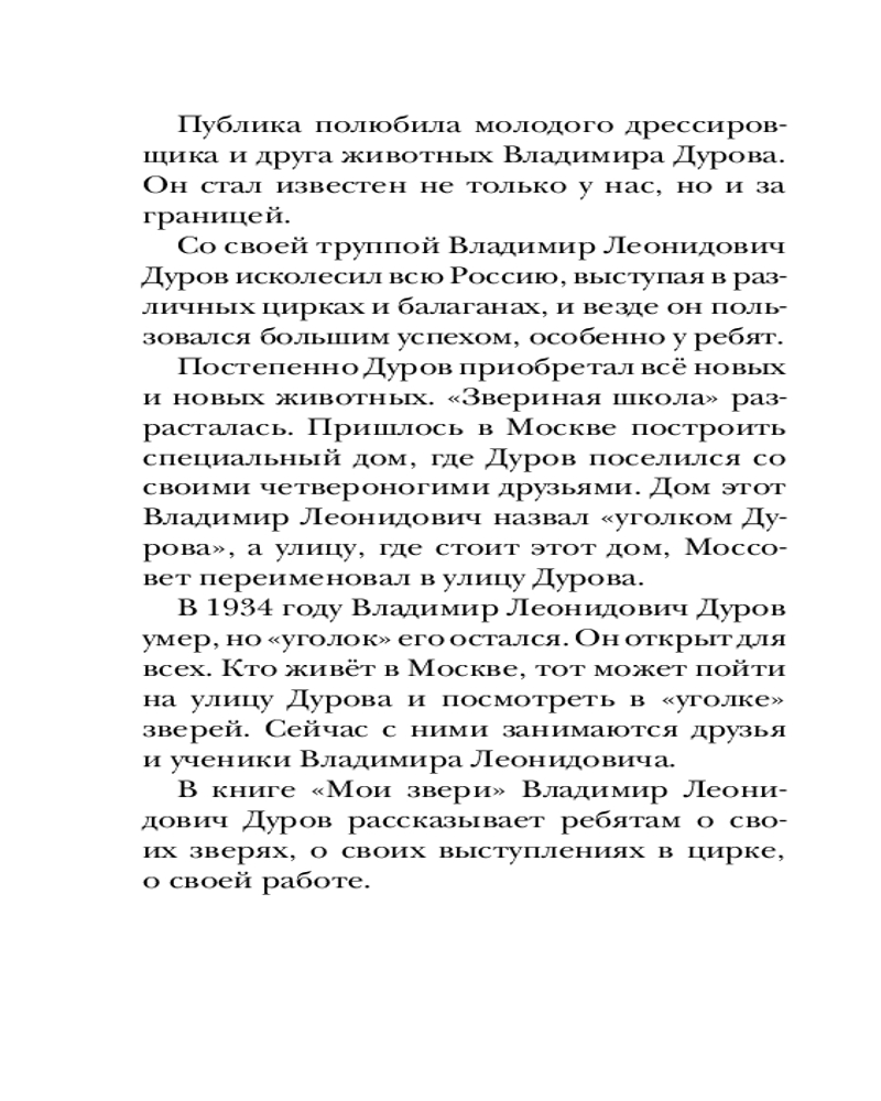 💳 Оплатить за товар можно при получении 🇰🇿 Есть бесплатная доставка по Казахстану от 1 дня 🎁 Копите бонусы с каждой покупки Серия: Детское чтение Владимир Леонидович Дуров (1863-1934) — известный дрессировщик, первый цирковой заслуженный артист СССР, создатель знаменитого театра зверей «Уголок Дурова», основатель династии цирковых артистов Дуровых. Про Владимира Дурова можно говорить много, но лучше всех он сам расскажет о себе и о своих зверях. В книгу вошли все рассказы из книги «Мои звери». |