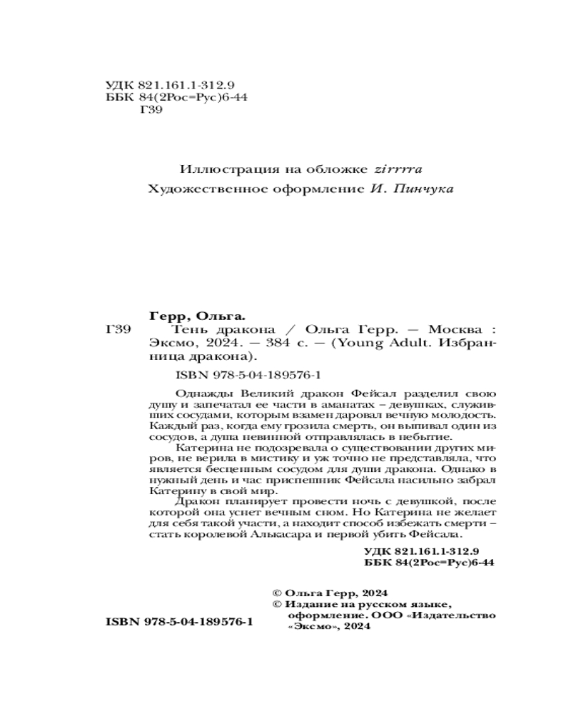 Серия: Young Adult. Избранница дракона Однажды Великий дракон Фейсал разделил свою душу и запечатал ее части в аманатах — девушках, служивших сосудами, которым взамен даровал вечную молодость. Каждый раз, когда ему грозила смерть, он выпивал один из сосудов, а душа невинной отправлялась в небытие. Катерина не подозревала о существовании других миров, не верила в мистику и уж точно не представляла, что является бесценным сосудом для души дракона. Однако в нужный день и час приспешник Фейсала насильно забрал Катерину в свой мир. |