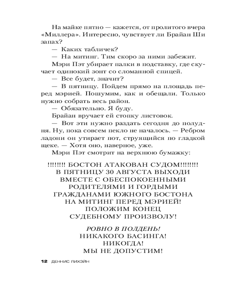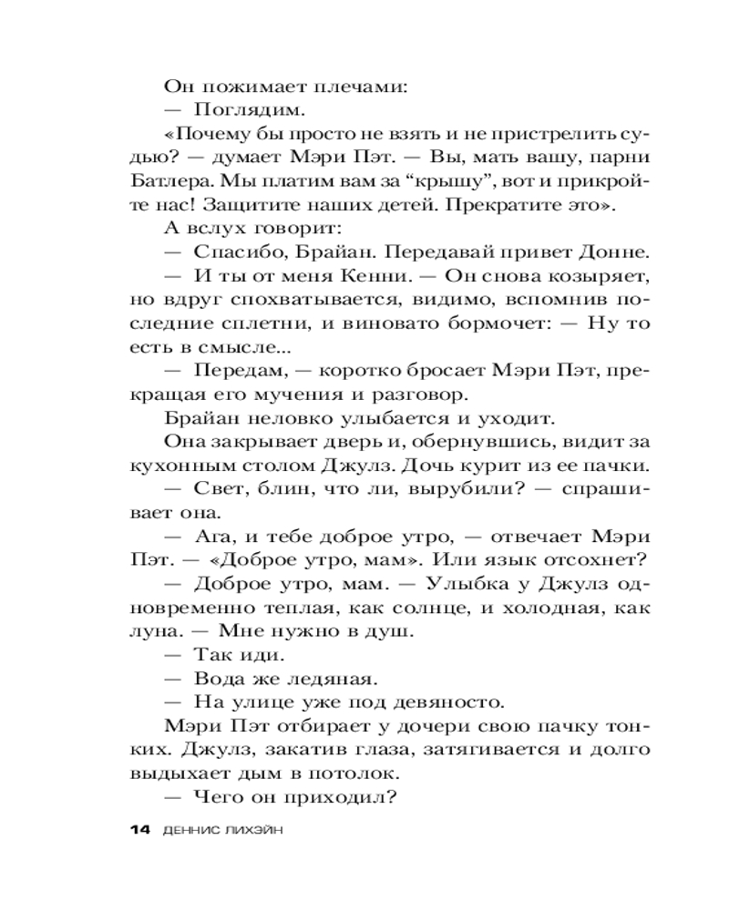 Серия: Tok. Деннис Лихэйн. От автора «Острова проклятых» Мэри Пэт Феннесси прожила всю свою жизнь в бостонском районе, известном как Южка. Этот ирландский анклав упорно придерживается старых традиций и гордо стоит особняком. Люди, выросшие здесь, не боятся ни бога, ни дьявола. И очень не любят, когда кто-то лезет в их жизнь... Однажды вечером Джулз, дочь Мэри Пэт, не вернулась домой. В тот же вечер на здешней станции метро находят мертвым парня, сбитого поездом при загадочных обстоятельствах. Эти два события кажутся не связанными между собой. Но Мэри Пэт в отчаянии начинает теребить людей, которых лучше не трогать, — и задавать вопросы, всерьез беспокоящие Марти Батлера, главаря местной ирландской мафии. А эти ребята не терпят неприятных вопросов... |