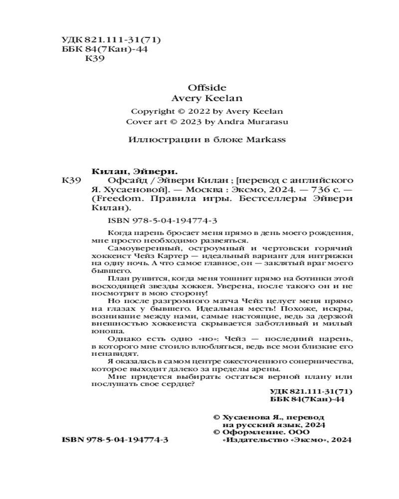 💳 Оплатить за товар можно при получении 🇰🇿 Есть бесплатная доставка по Казахстану от 1 дня 🎁 Копите бонусы с каждой покупки Серия: Freedom. Правила игры. Бестселлеры Эйвери Килан Когда после двух лет отношений парень бросает меня прямо в день моего рождения, мне просто необходимо развеяться. На вечеринке я встречаю Чейза Картера. Самоуверенный, остроумный и чертовски горячий хоккеист — идеальный вариант для интрижки на одну ночь. А что самое главное, он — заклятый враг моего бывшего. План рушится, когда меня тошнит прямо на ботинки этой восходящей звезды хоккея. Уверена, после такого он и не посмотрит в мою сторону! |