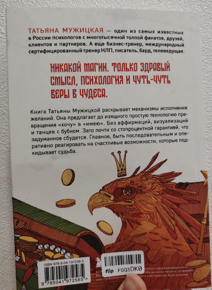 💳 Оплатить за товар можно при получении 🇰🇿 Есть бесплатная доставка по Казахстану от 1 дня 🎁 Копите бонусы с каждой покупки Серия: Психология по-русски До Татьяны Мужицкой существовало два подхода к осознанному исполнению желаний. Первый — ставь четкие цели и достигай их. Второй — рисуй карты желаний, посылай запросы Вселенной и жди, что она откликнется. По отдельности и тот, и другой методы нередко давали сбои. Сосредоточенные на цели рационалы часто игнорировали счастливые возможности, которые подбрасывала им судьба. А увлеченные аффирмациями мечтатели так и не приступали к настоящей работе. |