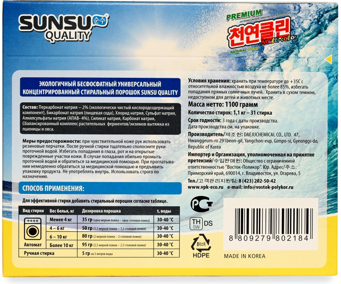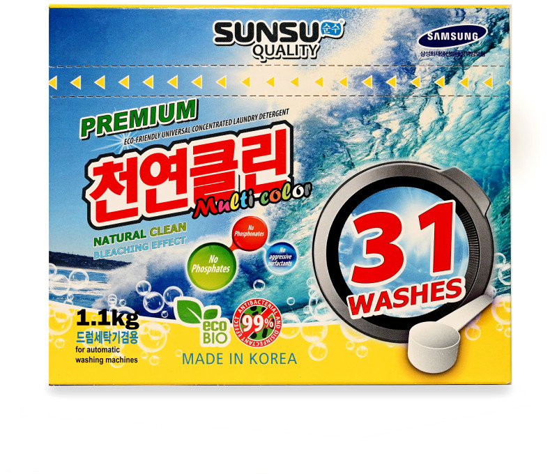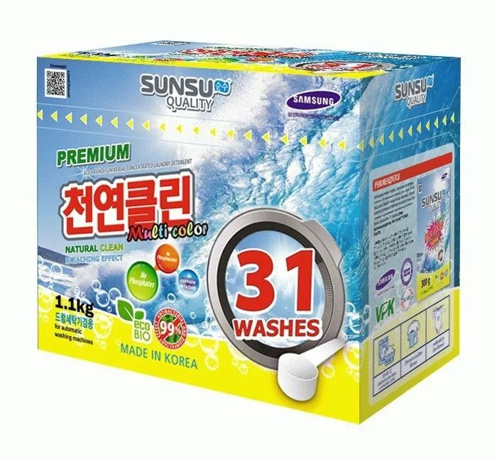 Бренд SUNSU Quality — это линейка бесфосфатных средств для стирки: универсальный, концентрированный, стиральный порошок для цветного и белого белья, а так же универсальный пятновыводитель. Бренд SUNSU имеет сертификаты ISO 9001 и ISO 14001, а так же застрахован компанией Samsung, что в свою очередь говорит о качестве и безопасности данной продукции для окружающей среды.