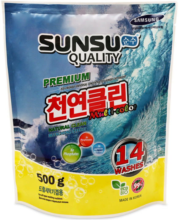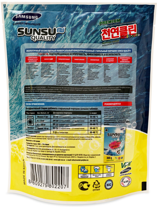 | Бренд SUNSU Quality — это линейка бесфосфатных средств для стирки: универсальный, концентрированный, стиральный порошок для цветного и белого белья, а так же универсальный пятновыводитель. Бренд SUNSU имеет сертификаты ISO 9001 и ISO 14001, а так же застрахован компанией Samsung, что в свою очередь говорит о качестве и безопасности данной продукции для окружающей среды. |