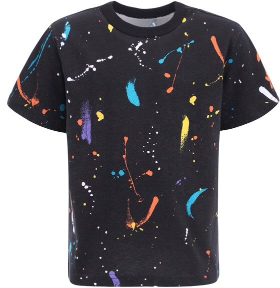 Футболка для мальчика выполнена из кулира — легкого хлопкового плотна. Изделие прямого силуэта и свободного кроя, с короткими рукавами со спущенной линией плеча, вырез горловины обработан эластичной бейкой из полотна компаньона. Футболка украшена яркой набивкой.