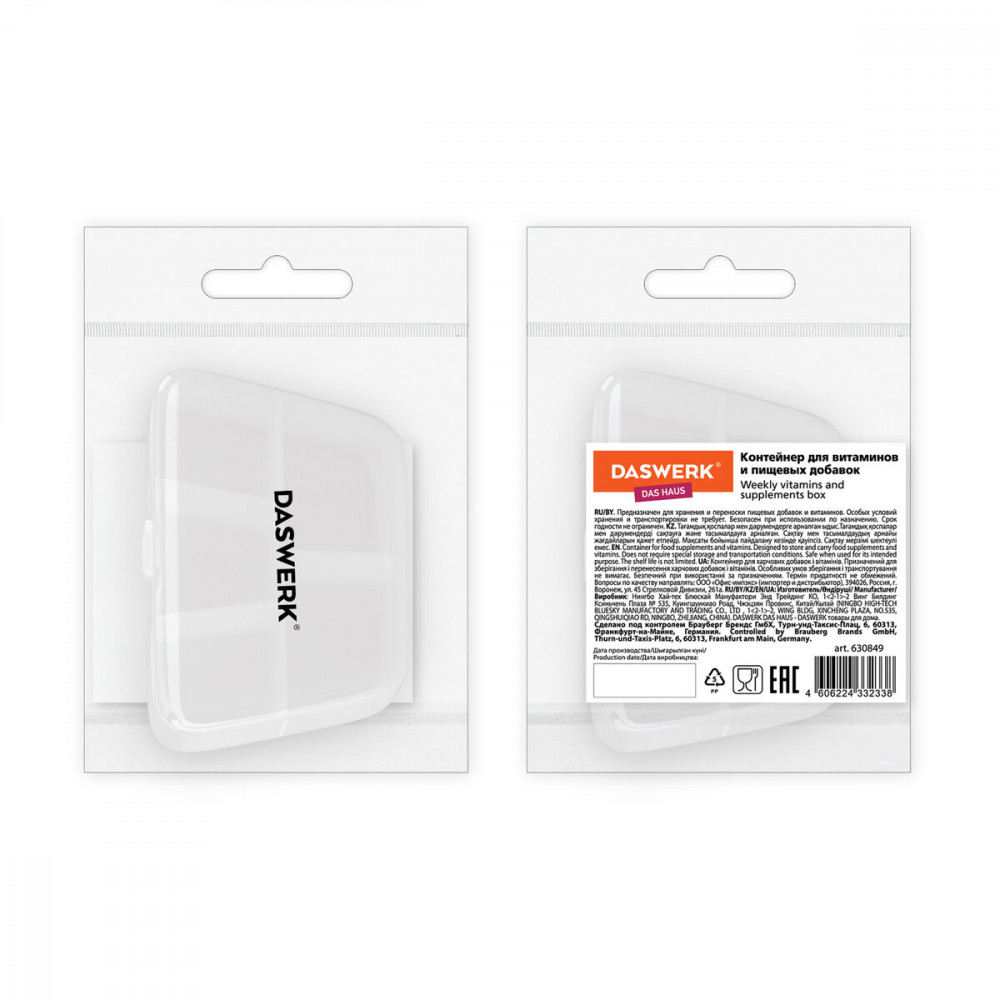 💳 Оплатить за товар можно при получении 🇰🇿 Есть бесплатная доставка по Казахстану от 1 дня 🎁 Копите бонусы с каждой покупки Таблетница DASWERK предназначена для надежного хранения лекарств, витаминов и пищевых добавок. Контейнер из легкого и прочного пластика гарантирует удобство и безопасность в использовании. |