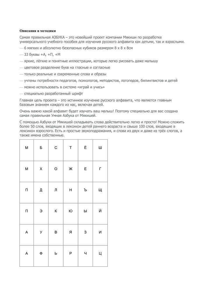 Мякиши Кубики «Азбука в картинках»В данный момент этот товар отсутствует в продаже. Возможно, у нас найдется аналогичный или похожий товар здесь. Главная цель проекта — это истинное изучение русского алфавита, что является главным базовым знанием каждого из нас, включая детей. Очень важно какой алфавит будет изучать ваш малыш! Поэтому специально для Вас создана самая правильная умная азбука от Мякишей. |