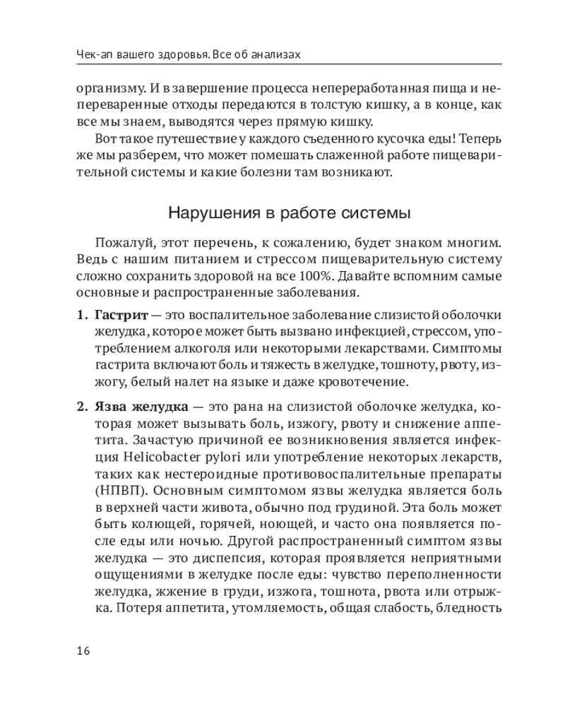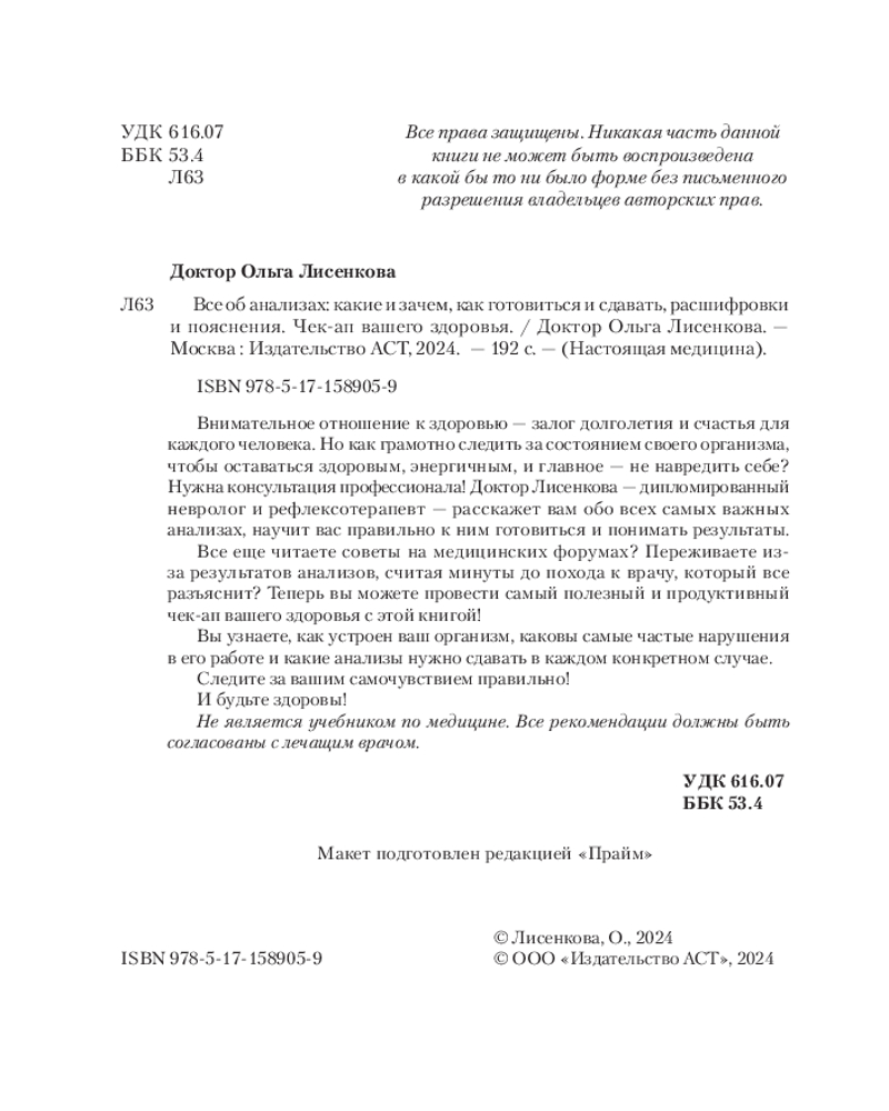 Классная книга по каждому пункту из списка анализов расшифровка (если понижен, если повышен, причины из изменений). Врачи на приеме с учётом времени приема расшифровки не дают. Только общая картина понятная им. Конечно пациенты бывают разные. Может кому-то и двух слов от врача "в целом все нормально" и хватит, а кому-то нужно подробно раскрыть имеющуюся картину. В домашних условиях эта книга как настольная книга для расшифровки анализов анализов. В начальных главах идёт описание по органам, связанных с анализами. Автор врач Лисенкова О.качественно выполнила свою работу в этой книге. Полезную для пациентов, читателей напечатала книгу.