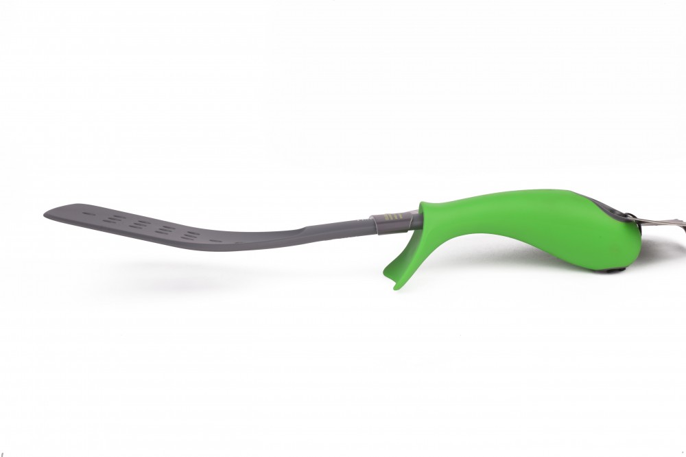 Удобная, приятная на ощупь и в применении ручка, единственное - требуются глубокие крючки, чтобы вешать эту лопатку, хорошей жесткости: не твердая, но и не мягкая.
