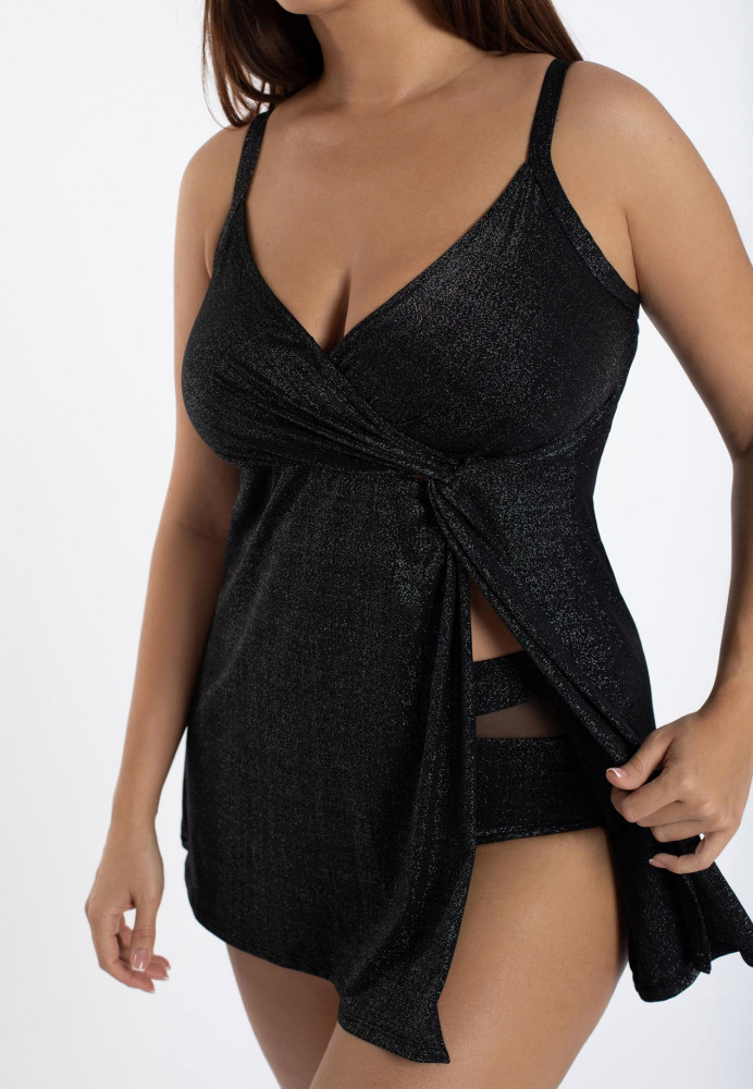 Верх купальника-танкини без косточек с тонкими вшитыми корректорами. Дополнительный комфорт и защиту при ношении обеспечивают дышащие, быстровысыхающие вшитые корректоры spacer. Лиф без косточек обеспечивает надежную поддержку и комфорт за счет эластичной ленты под грудью. Спереди декоративный перекрут. Спереди сбоку — разрез. Бретели регулируются.
