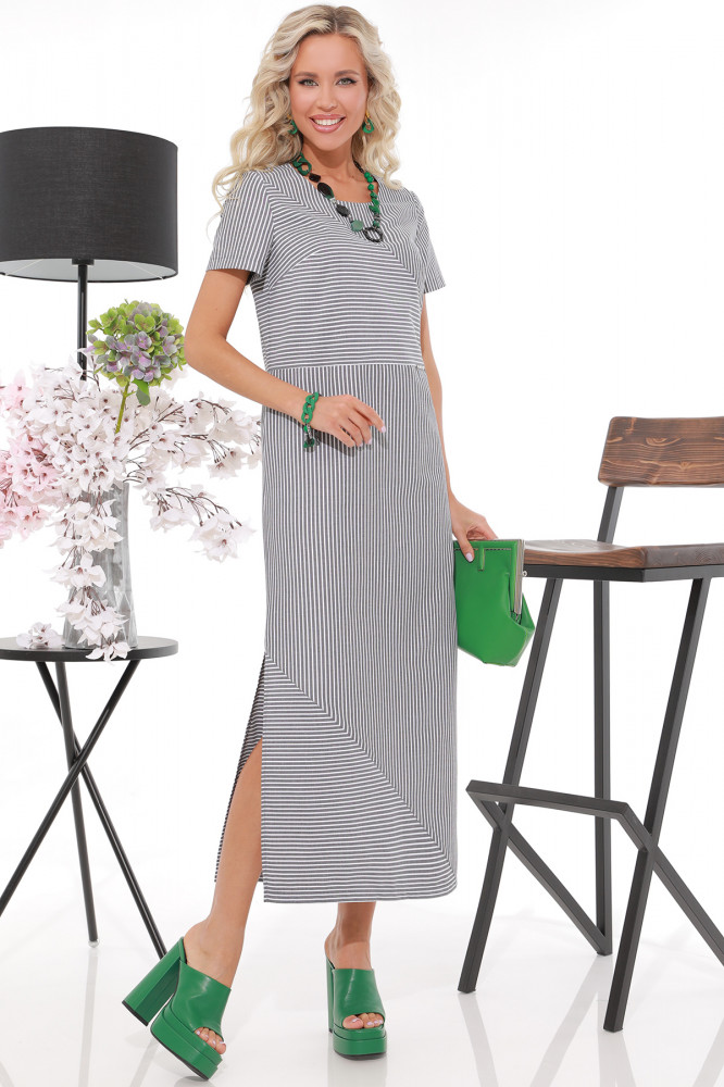 Платье макси с разрезами по бокам — это стильная модель для поздней весны и лета. Оно выполнено из легкого и приятного на ощупь материала. Свободный, практически прямой силуэт не стесняет движения и скрывает недостатки фигуры, если таковые есть. У платья есть укороченные рукава, которые прикрывают плечи и верхнюю часть рук. Изюминку модели придает принт полоска, скомбинированный несколькими блоками, что придает динамичности образу