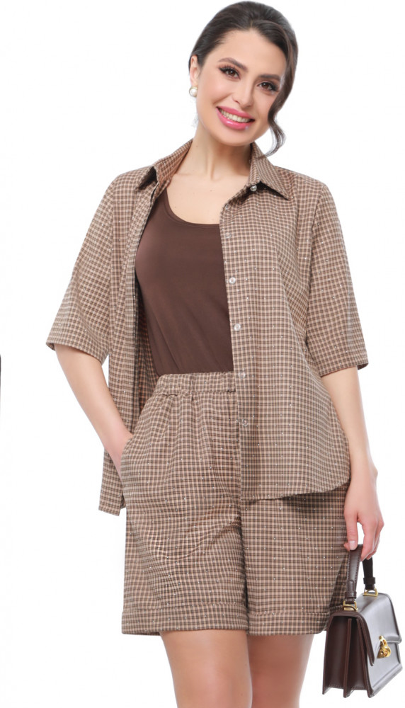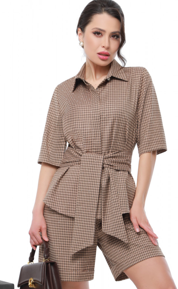 Костюм шикарный! Выглядит дорого-богато. Ткань плотная, но не жаркая, к телу очень приятная. Единственное, обратите внимание, что на ткани приклеены стразы. Я их не заметила, когда выбирала, хотя в описании на сайте об этом написано, но я не прочитала, на солнце они не сияют, но вживую их видно сильнее, чем здесь на фото. Но зато этот костюм можно надеть в летнее время на любую вечеринку, будешь сиять! Рубашку можно комбинировать с любыми брюками, джинсами-она просто восторг. Шорты тоже можно носить и с другими футболками. С поясом этот комплект очень элегантно выглядит, очень женственный образ.
