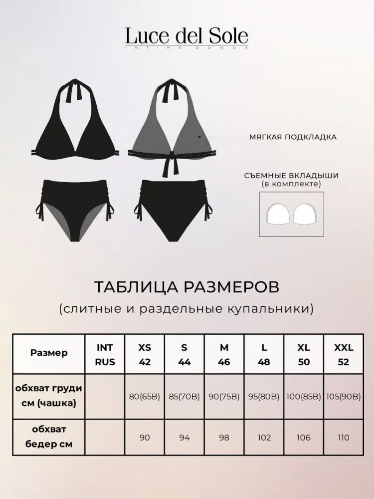Купила дочери 12 лет, размер 46 сел отлично, модель плавок очень удачная,лиф тоже удобный, на завязках. материал мягкий, цвет очень красивый. Рекомендую.