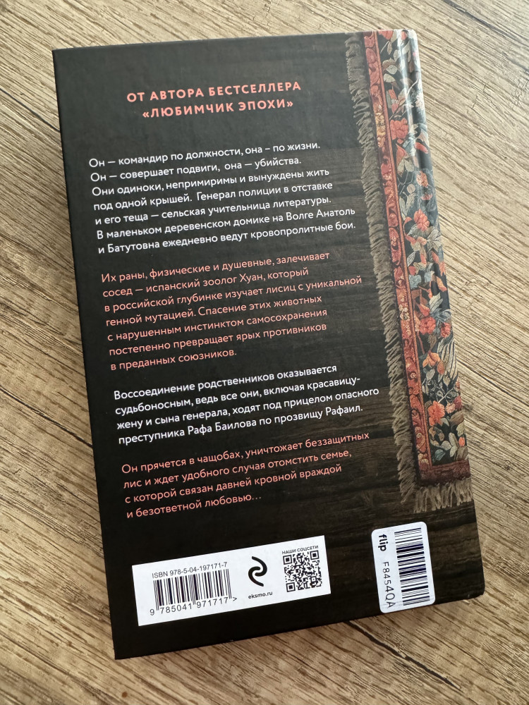 Приобрела по рекомендации в инстаграме, что вот новинка, книга «топ года». Тут я не соглашусь. Да история довольна обычная, про жизнь одного генерала и его окружающих близких людей. Который будет проживать с тещей, и по соседству будет итальянец зоолог, который будет изучать популяцию лис с редким геном, как они его позже прозвали геном Рафаила. Да автор писала с чувством юмора, в каких-то моментах очень смешно, порой и грустно. Но, не получила того удовольствия от прочтения книги, когда читаешь с вдохновением, где автор красиво, литературно пишет в произведениях, где как минимум пополнишь словарный запас, не говоря уж о впечатлениях. Тут же, книга написана обычной разговорно-бытовой речью. Просто история, которая возможно и встречается в наше время. Не более. Перечитывать точно не стала бы, да и в коллекции не думаю что оставлю.