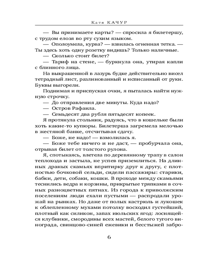 | Катя Качур родилась на Волге, в городе Куйбышеве (ныне Самара) в 1973 году. С трех лет писала стихи и рассказы. Училась в Самарском государственном Университете на биолога. Для дипломной работы на лыжах тропила (ходила по следу) лисиц в поволжских лесах. В ходе защиты выпускного проекта любовь к лисам и творческая фантазия затмили перед комиссией недостоверность фактов, и автор получила «отлично». После окончания университета работала корреспондентом, а также вела программы новостей и... |