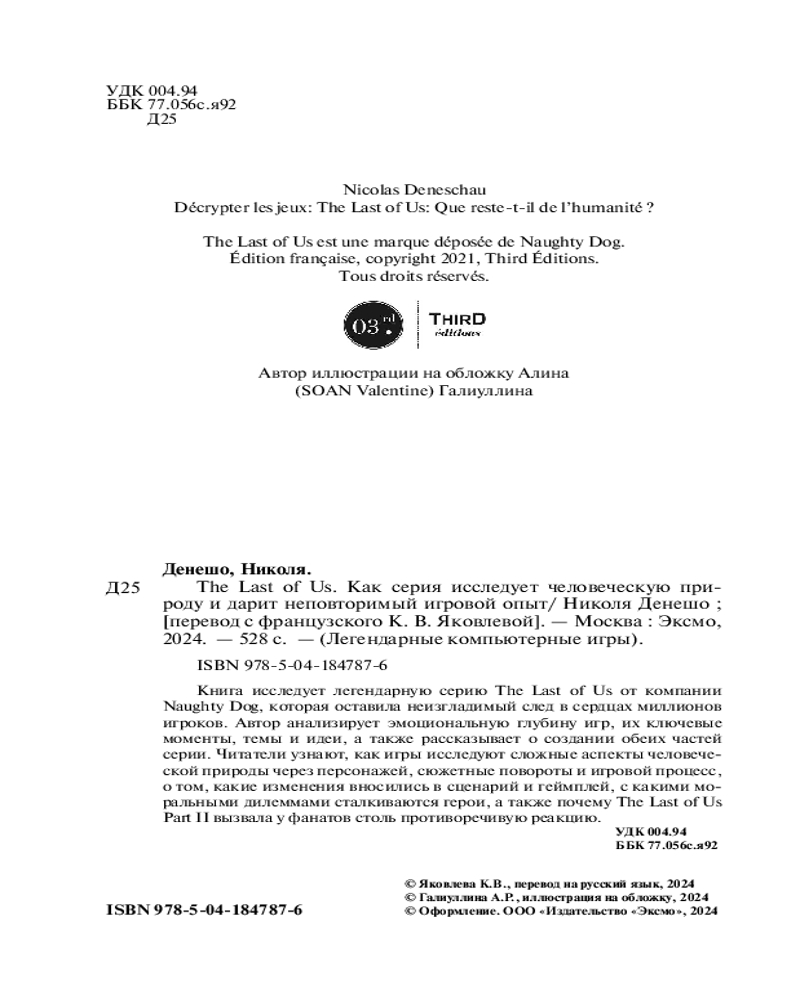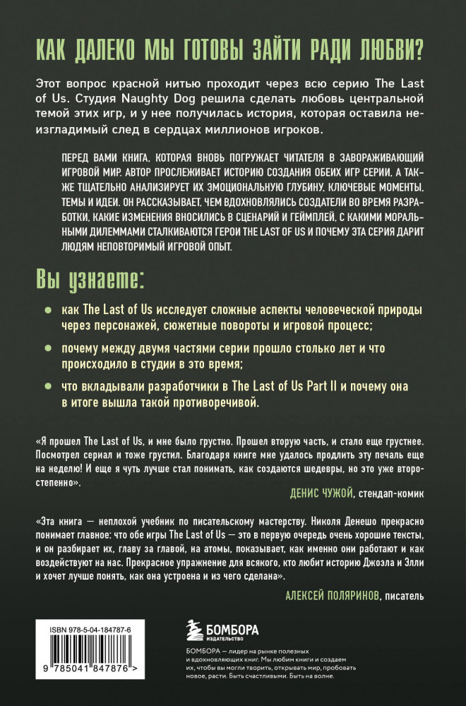 💳 Оплатить за товар можно при получении 🇰🇿 Есть бесплатная доставка по Казахстану от 1 дня 🎁 Копите бонусы с каждой покупки Серия: Легендарные компьютерные игры Как далеко мы готовы зайти ради любви? Этот вопрос красной нитью проходит через всю серию The Last of Us. Студия Naughty Dog решила сделать любовь центральной темой этих игр, и у них получилась история, которая оставила неизгладимый след в сердцах миллионов игроков. Перед вами книга, которая вновь погружает читателя в завораживающий игровой мир. Автор прослеживает историю создания обеих игр серии, а также тщательно анализирует их эмоциональную глубину, ключевые моменты, темы и идеи. Он расскажет, чем вдохновлялись создатели во время разработки, какие изменения вносились в сценарий и геймплей, с какими моральными дилеммами сталкиваются герои The Last of Us и почему эта серия дарит людям неповторимый игровой опыт. |