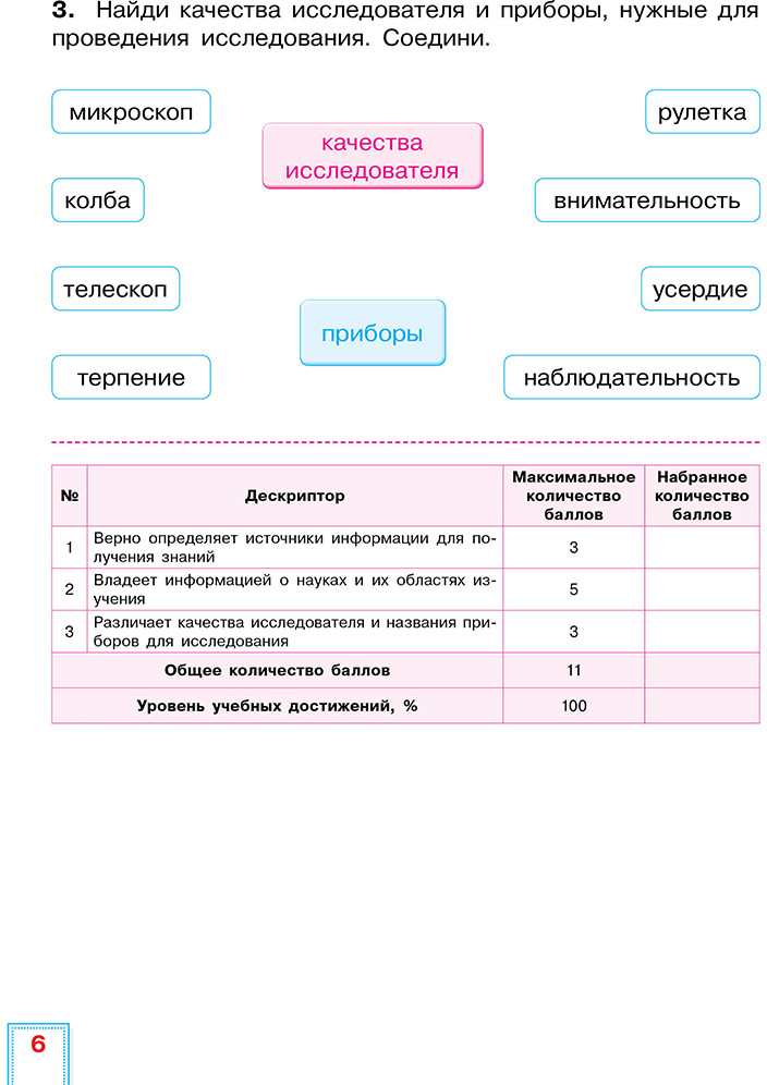 Пособие содержит таблицы, где можно фиксировать динамику развития подготовленности каждого обучающегося, что важно в поддержании его целенаправленной активности и самостоятельности в достижении цели. В процессе фиксирования осуществляется сбор доказательств, демонстрирующих знания и навыки обучающихся согласно содержанию учебной программы. Для оказания помощи учителю в принятии объективного решения относительно каждого обучающегося к заданиям разработаны дескрипторы. Учебные задания СОР и СОЧ для оценивания достижений обучающихся включают пройденные (изученные) цели обучения. Критерии оценивания соответствуют содержанию и целям обучения.