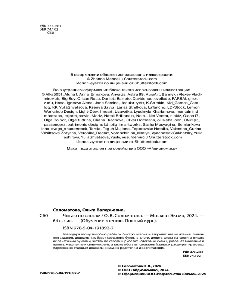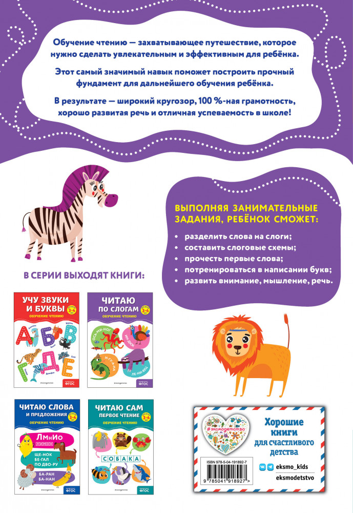 Читаю по слогамВ данный момент этот товар отсутствует в продаже. Возможно, у нас найдется аналогичный или похожий товар здесь. Серия: Обучение чтению. Полный курс Выполняя увлекательные игровые задания, дошкольник будет соединять буквы в слоги, делить слова на слоги и писать их печатными буквами, читать по слогам и рисовать слоговые схемы, разовьет внимание и память, мышление и связную речь. Именно эти навыки позволят ему в дальнейшем успешно учиться в школе и реализовать все свои таланты. Классическая методика, используемая авторами пособия, гарантирует высокий результат. Кроме того, занимаясь, ребенок станет более усидчивым, внимательным и организованным, приобретет опыт самоконтроля и самооценки, а главное, будет положительно настроен к обучению и уверен в своих силах. Все задания сформулированы просто, не требуют пояснений со стороны взрослого и разнообразны по своему характеру, что позволит ребенку чаще менять виды деятельности и меньше уставать. |