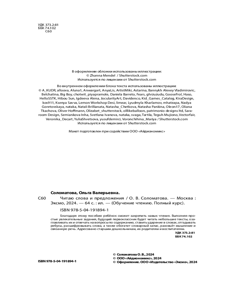 💳 Оплатить за товар можно при получении 🇰🇿 Есть бесплатная доставка по Казахстану от 1 дня 🎁 Копите бонусы с каждой покупки Серия: Обучение чтению. Полный курс Выполняя увлекательные игровые задания, дошкольник закрепит навык чтения и понимания смысла прочитанного, потренируется определять место слога в слове, составлять слова из букв и других слов, ставить ударение в словах, озаглавливать тексты, отвечать на вопросы по содержанию. Именно эти навыки позволят ему в дальнейшем успешно учиться в школе и реализовать все свои таланты. Классическая методика, используемая авторами пособия, гарантирует высокий результат. Кроме того, занимаясь, ребенок станет более усидчивым, внимательным и организованным, приобретёт опыт самоконтроля и самооценки, а главное, будет положительно настроен к обучению и уверен в своих силах. Все задания сформулированы просто, не требуют пояснений со стороны взрослого и разнообразны по своему характеру, что позволит ребенку чаще менять виды деятельности и меньше уставать. |