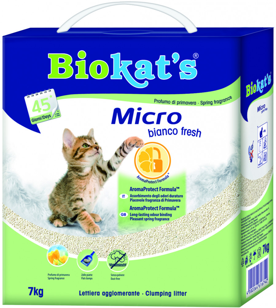 Micro bianco Fresh от Biokat — это белый комкующийся наполнитель, состоящий из натуральной глины, который особенно подходит для соблюдения высоких стандартов гигиены и чистоты. С AromaProtect Formula™ для длительного связывания запахов и приятного весеннего аромата.