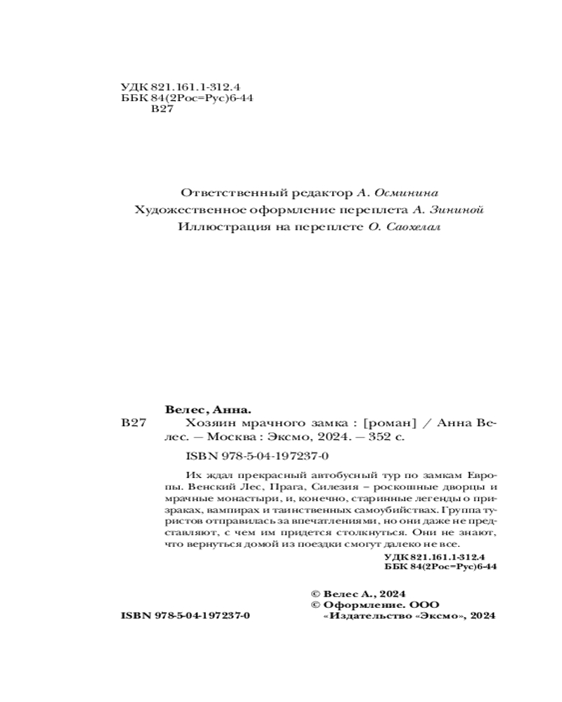 💳 Оплатить за товар можно при получении 🇰🇿 Есть бесплатная доставка по Казахстану от 1 дня 🎁 Копите бонусы с каждой покупки Серия: По следам городских легенд. Современный мистический триллер Смертельный туристический маршрут. Их ждал прекрасный автобусный тур по замкам Европы. Венский Лес, Прага, Силезия — роскошные дворцы и мрачные монастыри и, конечно, старинные легенды о призраках, вампирах и таинственных самоубийствах. Группа туристов отправилась за впечатлениями, но они даже не представляют, с чем им придется столкнуться. Они не знают, что вернуться домой из поездки смогут далеко не все. |