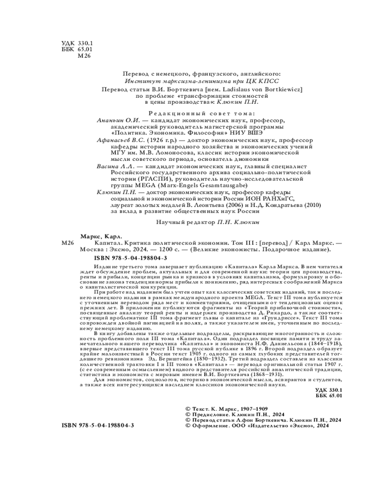 💳 Оплатить за товар можно при получении 🇰🇿 Есть бесплатная доставка по Казахстану от 1 дня 🎁 Копите бонусы с каждой покупки Серия: Великие экономисты. Подарочное издание Издание третьего тома завершает публикацию «Капитала» Карла Маркса. Читателя ждет обсуждение проблем, актуальных и для современной науки: теории цен производства, ренты и прибыли, концепции рынка и кризисов в условиях капитализма, формулировку и обоснование закона тенденции нормы прибыли к понижению, ряд интересных соображений Маркса о капиталистической конкуренции. При работе над изданием был учтен опыт как классических советских изданий, так и последнего немецкого издания в рамках международного проекта MEGA. Текст III тома публикуется с уточненным переводом ряда фрагментов и комментариями, очищенными от тенденциозных оценок прежних лет. В приложении — отрывки из «Теорий прибавочной стоимости», посвященные анализу теорий ренты и издержек производства Д. Рикардо, а также соответствующий проблематике III тома фрагмент главы о капитале из «Грундриссе». Текст III тома сопровожден двойной пагинацией на полях, а также указателем имен, уточненным по последнему немецкому изданию. |