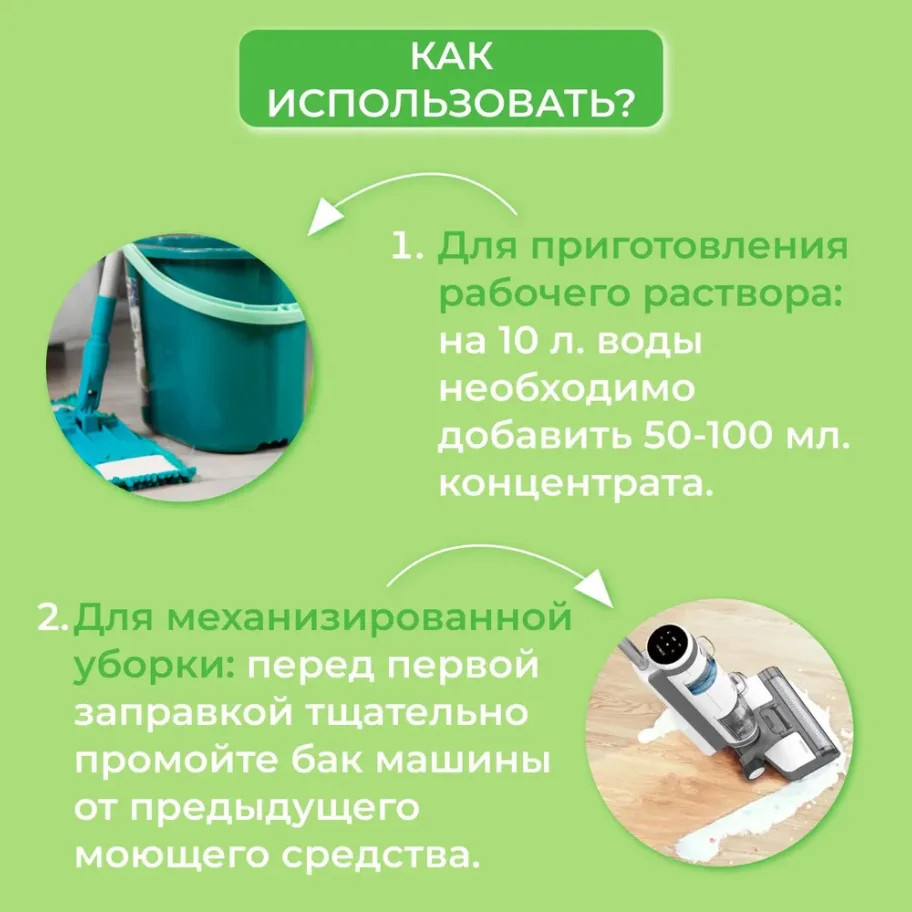 Способ применения: для приготовления рабочего раствора на 10 л воды необходимо добавить 50-100 мл концентрата. Для механизированной уборки перед первой заправкой необходимо тщательно промыть бак моющего пылесоса или машины от предыдущего моющего средства.
