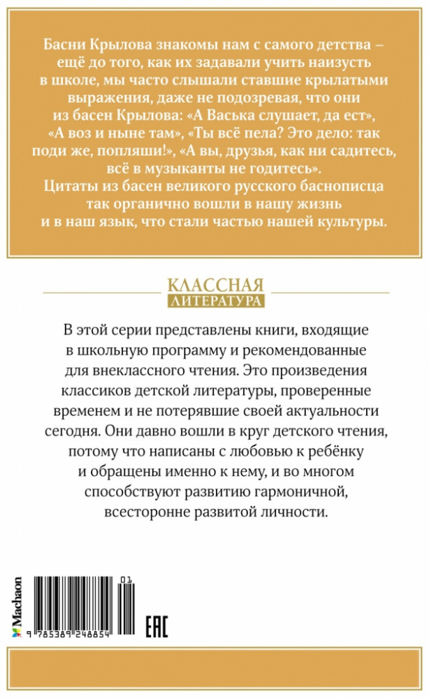 💳 Оплатить за товар можно при получении 🇰🇿 Есть бесплатная доставка по Казахстану от 1 дня 🎁 Копите бонусы с каждой покупки Серия: Классная литература Басни Крылова знакомы нам с самого детства — ещё до того, как их задавали учить наизусть в школе, мы часто слышали ставшие крылатыми выражения, даже не подозревая, что они из басен Крылова: «А Васька слушает, да ест», «А воз и ныне там», «Ты всё пела? Это дело: так поди же, попляши!», «А вы, друзья, как ни садитесь, всё в музыканты не годитесь». Цитаты из басен великого русского баснописца так органично вошли в нашу жизнь и в наш язык, что стали частью нашей культуры. |