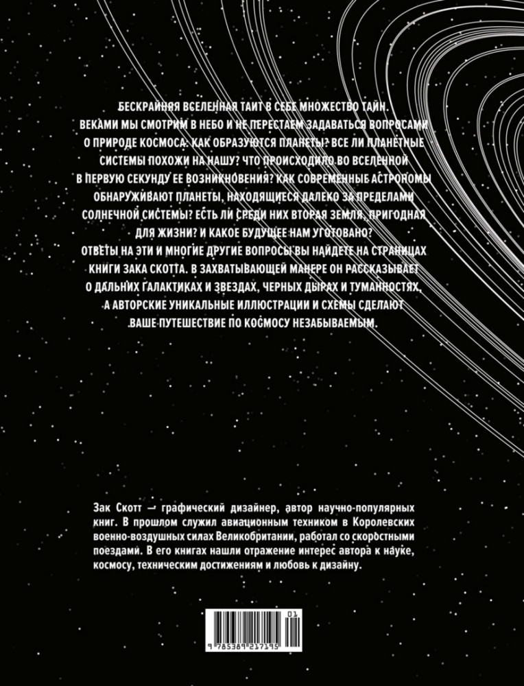 💳 Оплатить за товар можно при получении 🇰🇿 Есть бесплатная доставка по Казахстану 🎁 Копите бонусы с каждой покупки Серия: Научный интерес Небо с древних времен завораживало человека. От шумерских лунных календарей до снимков НАСА люди не перестают задаваться вопросами, как устроен космос. Зак Скотт приглашает читателя в увлекательное путешествие по Вселенной, доступно рассказывая о Солнечной системе, рождении галактик, темной материи, Большом взрыве и многом другом. Скотт пишет просто о сложном: что такое гравитация, как светят звезды, когда закончился Большой взрыв и закончился ли вообще. Вместе с данным уникальным и подробным путеводителем по самым загадочным уголкам космоса вы узнаете о черных дырах, побываете в галактике М87, увидите, с чего все началось и чем завершится. Автор убедительно и четко выстраивает хронологию существования Вселенной и предлагает гипотезы будущего, когда звезды погаснут и все вокруг погибнет. |