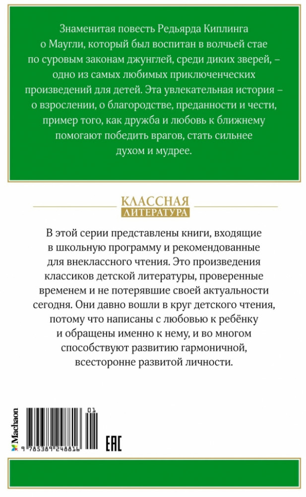 💳 Оплатить за товар можно при получении 🇰🇿 Есть бесплатная доставка по Казахстану от 1 дня 🎁 Копите бонусы с каждой покупки Серия: Классная литература Знаменитая повесть Редьярда Киплинга о Маугли, который был воспитан в волчьей стае по суровым законам джунглей, среди диких зверей, — одно из самых любимых приключенческих произведений для детей. Эта увлекательная история — о взрослении, о благородстве, преданности и чести, пример того, как дружба и любовь к ближнему помогают победить врагов, стать сильнее духом и мудрее. |