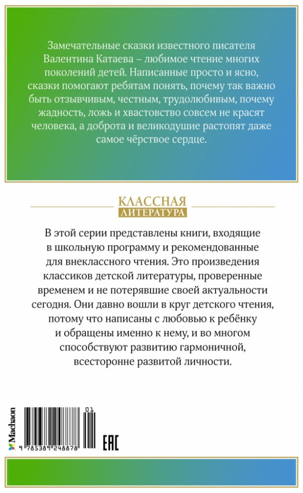 💳 Оплатить за товар можно при получении 🇰🇿 Есть бесплатная доставка по Казахстану от 1 дня 🎁 Копите бонусы с каждой покупки Серия: Классная литература Замечательные сказки известного писателя Валентина Катаева — любимое чтение многих поколений детей. Написанные просто и ясно, сказки помогают ребятам понять, почему так важно быть отзывчивым, честным, трудолюбивым, почему жадность, ложь и хвастовство совсем не красят человека, а доброта и великодушие растопят даже самое чёрствое сердце. |
