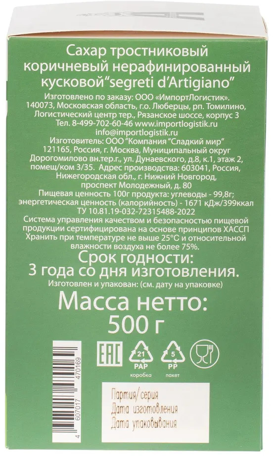 Segreti d’Artigiano Сахар тростниковый кусковой-25% +52 приятный вкус карамельный вкус хорошее качество подходит для кофе