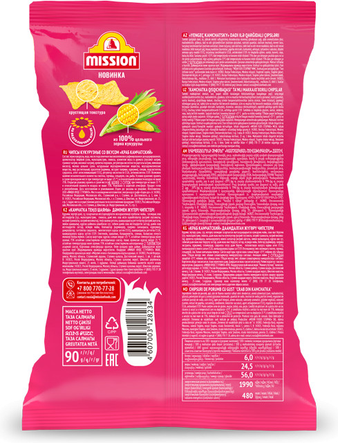 Зерно кукурузы, вода, масло подсолнечное высокоолеиновое рафинированное дезодорированное, ароматизатор пищевой (соль, мальтодекстрин, глюкоза, усилители вкуса и аромата (глутамат натрия, гуанилат натрия, инозинат натрия), креветка порошок, регуляторы кислотности (ацетаты натрия, лимонная кислота), молоко цельное сухое, натуральные вкусоароматические вещества, вкусоароматические вещества, жир растительный, красители (кармины, экстракт паприки, куркумин), специи, подсластитель сукралоза, агент антислеживающий Е551), регулятор кислотности Е526, антиокислитель Е319.