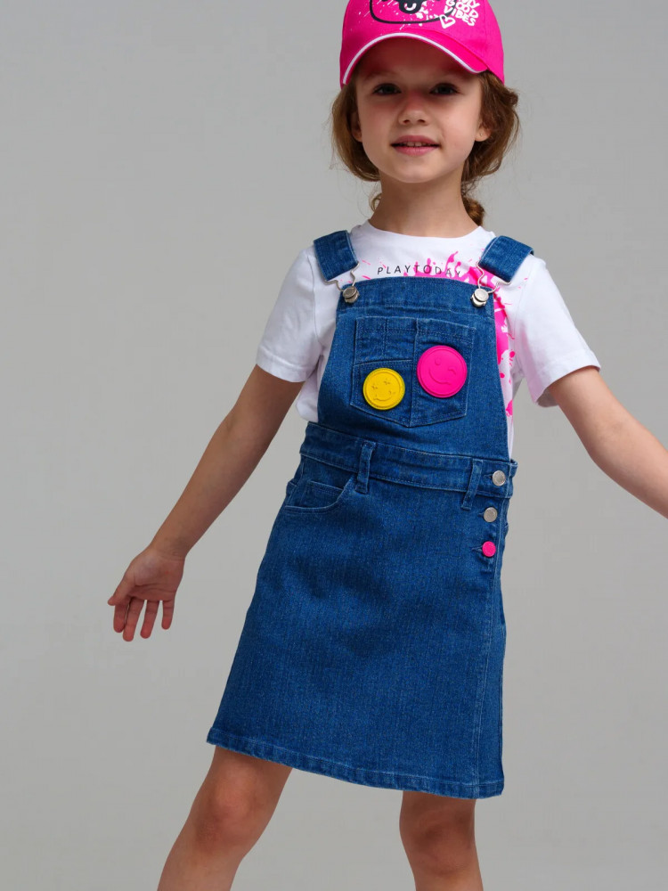 Сарафан джинсовый для девочки. Пояс на резинке с утяжкой, застежка на пуговицы.