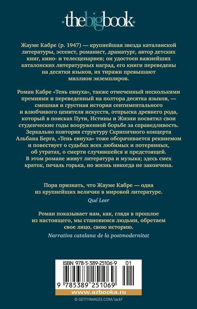 💳 Оплатить за товар можно при получении 🇰🇿 Есть бесплатная доставка по Казахстану от 1 дня 🎁 Копите бонусы с каждой покупки Серия: The Big Book (мягкая обложка) Жауме Кабре (р. 1947) — крупнейшая звезда каталанской литературы, эссеист, романист, драматург, автор кино- и телесценариев; он удостоен важнейших каталонских литературных наград, его книги переведены на десятки языков, их тиражи превышают миллион экземпляров. Роман Кабре «Тень евнуха», также отмеченный несколькими премиями и переведенный на полтора десятка языков, — смешная и грустная история сентиментального и влюбчивого ценителя искусств, отпрыска древнего рода, который в поисках Пути, Истины и Жизни посвятил свои студенческие годы вооруженной борьбе за справедливость. Зеркально повторяя структуру Скрипичного концерта Альбана Берга, «Тень евнуха» тоже оборачивается реквиемом и повествует о судьбах всех любимых и потерянных, об утратах, о смерти случившейся и предстоящей. В этом романе живут литература и музыка; здесь смех краток, печаль горька, но жизнь никогда не закончена. |