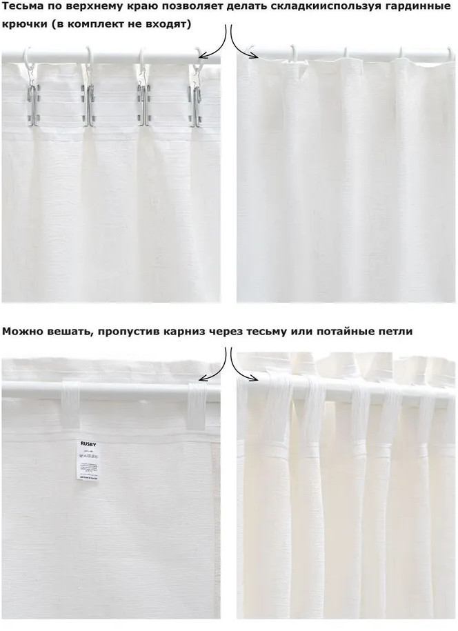 Универсальная тесьма позволяет легко повесить интерьерные шторы на любое крепление, будь то карниз с шторной лентой для крючков или кулиска для трубы. Вы также можете использовать гардинные карнизы или шины. Тесьма по верхнему краю позволяет создавать элегантные складки с помощью гардинных крючков. Шторы можно вешать, пропуская карниз через потайные петли, или с помощью колец и крючков. Наши льняные однотонные портьеры имеют минималистичный дизайн в современном скандинавском стиле, что позволяет им вписаться в любой интерьер. Они легкие, качественные и идеально подходят для использования в гостиной, зале, прихожей, кабинете, офисе, примерочной, на даче, лоджии, веранде или на балконе. Крючки, кольца и зажимы не входят в комплект.