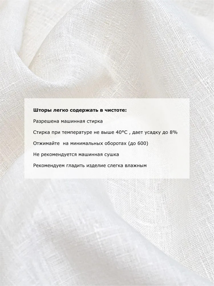 Особенности ухода: разрешена машинная стирка, стирка при температуре не выше 40С, отжим на минимальных оборотах (до 600), стирать отдельно от других вещей, не рекомендуется машинная сушка, рекомендуется гладить изделие слегка влажным. Перед корректировкой длины обязательно постирайте штору. Возможна усадка до 5-7 %.