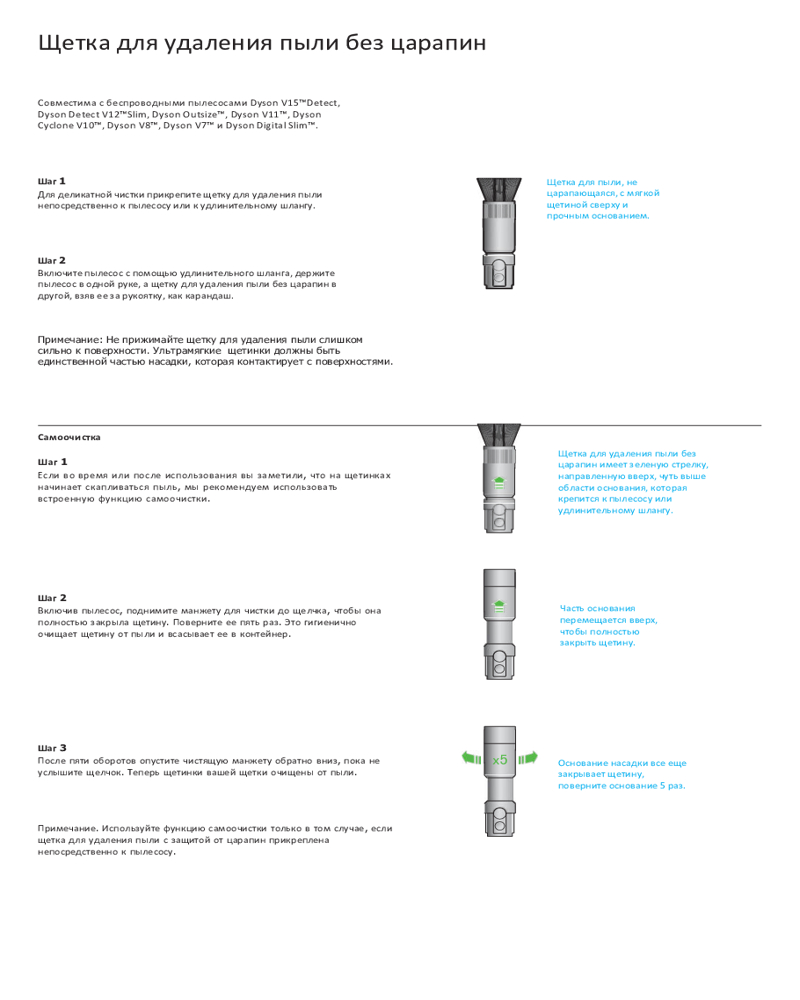 Благодаря бесщеточному двигателю, который вращается со скоростью 3600 об/мин, погружая щетинки глубже в ворс ковра, насадка эффективно удаляет пыль и волосы с любого типа напольных покрытий. Мини электрощетка с коническим валом предотвращает спутывание шерсти и волос. Насадка может легко удалить пыль, застрявшую в глубине обивки, лестницах, матрасах и других грязных местах в доме. 56 зубцов из поликарбоната расположены вдоль вала для предотвращения наматывания волос. Зубцы автоматически удаляют волосы с щетинок, сохраняя постоянную эффективность сбора пыли и избавляя от необходимости чистить вал вручную. Черные щетинки из антистатического углеродного волокна собирают мелкую пыль с твердых напольных покрытий. Многофункциональность беспроводной технологии от Dyson упрощает уборку всего дома. Мощная очистка полов, труднодоступных мест и матрасов.