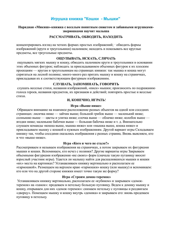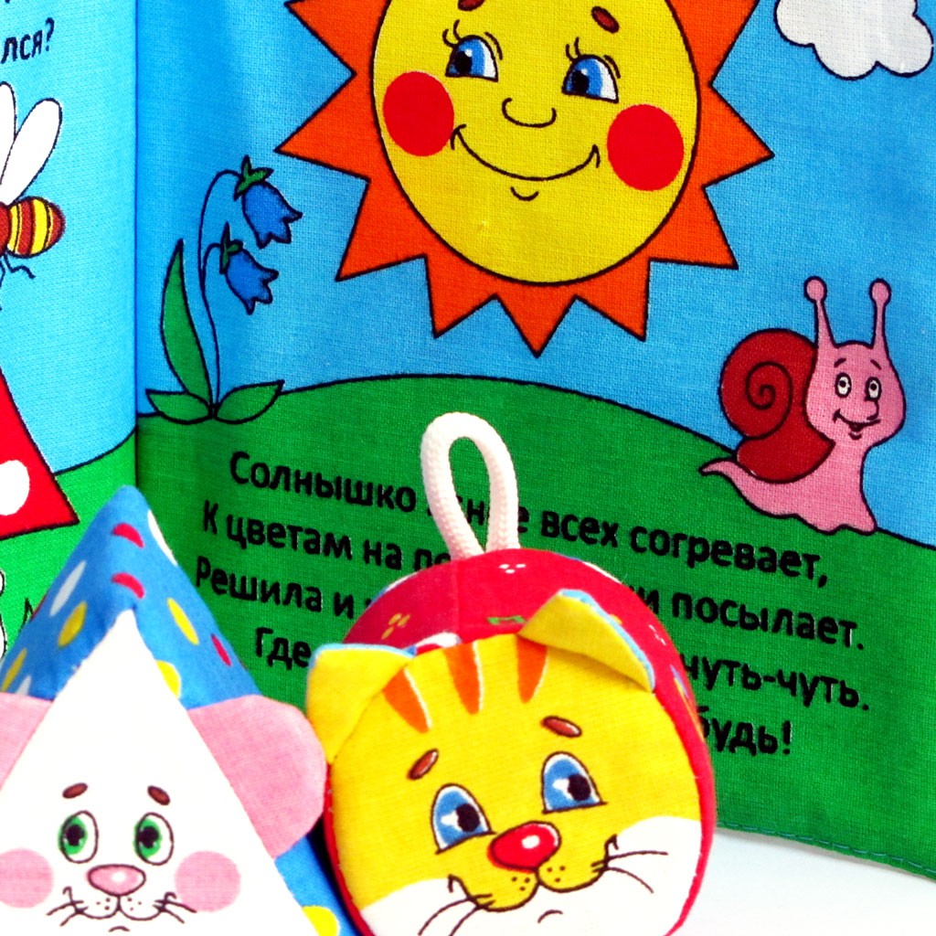 Кота и мышонка очень удобно держать маленькими ручками малыша, мягкие и не линяют. Мышонок еще пищит :) при нажатии. А вот с книжкой малыш не играет, наверно, мал еще.