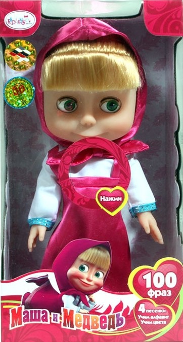 Мульти-Пульти Говорящая кукла МашаВ данный момент этот товар отсутствует в продаже. Возможно, у нас найдется аналогичный или похожий товар здесь. Серия: Маша и Медведь Говорящая кукла Маша персонаж популярного мультфильма – замечательный подарок любому малышу! Маша говорит 100 фраз , поет 4 песенки из мультфильма "Маша и Медведь" голосом персонажа. Кукла это всегда прекрасный подарок для девочки. |