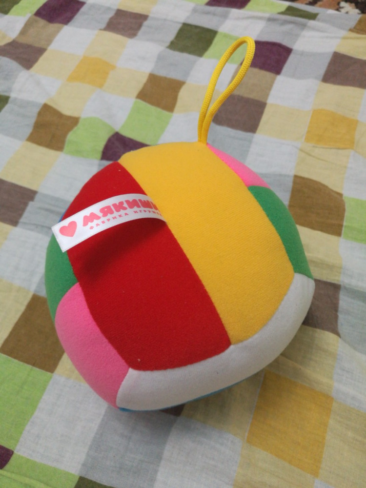 Мяч понравился, соответствует изображенному, на фото немного ярче, чем в действительности. Он довольно большой, погремушка тихая. Долго искала что-то подобное, и чтобы был российского производства, нашла только здесь, рада. Ткань мягкая, сам мяч - приятный на ощупь и не тяжелый. Покупкой довольна.