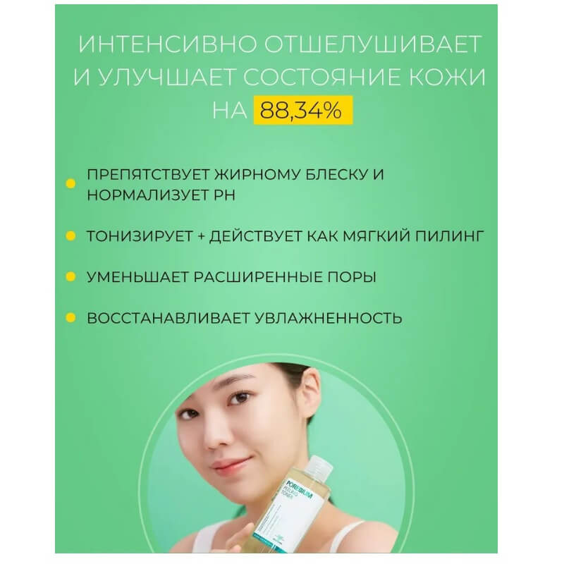 Тоник проникает глубоко в поры и тщательно их очищает, растворяет жировые пробки и помогает в борьбе с чёрными точками, делая их менее заметными. Осветляет сальные нити и способствует сужению расширенных пор. Стимулирует процессы регенерации, ускоряя рассасывание постакне, заживляя воспаления и мягко осветляя.