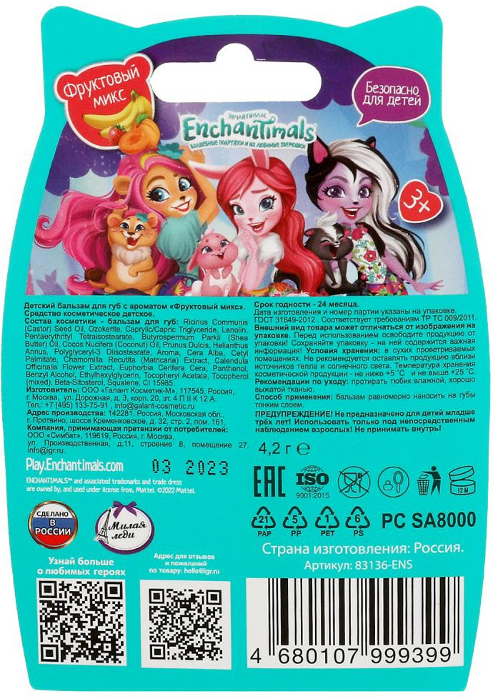 Милая Леди Бальзам для губВ данный момент этот товар отсутствует в продаже. Возможно, у нас найдется аналогичный или похожий товар здесь. Серия: Enchantimals Этот бальзам создан специально для детских губ. Благодаря комплексу полезных масел, Д-пантенолу и витамину Е, он бережно питает и увлажняет кожу губ, защищает от негативного влияния природных факторов и восстанавливает повреждённую кожу. |