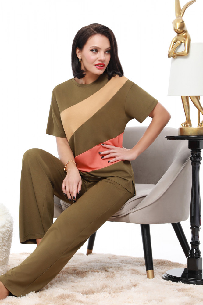 Брюки на рост 160 длинные. Надо будет отрезать и подшивать. Расцветка бледнее,чем на фото, нижняя полоска на футболке не коричневая, а цвета хаки