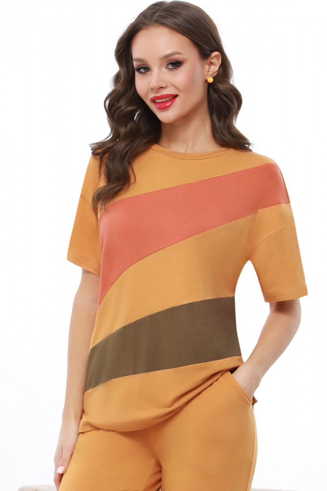 Брюки на рост 160 длинные. Надо будет отрезать и подшивать. Расцветка бледнее,чем на фото, нижняя полоска на футболке не коричневая, а цвета хаки