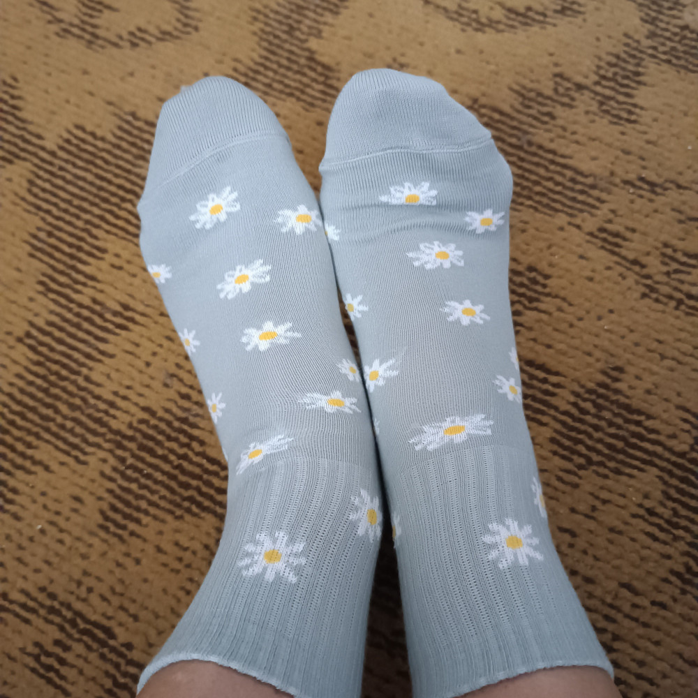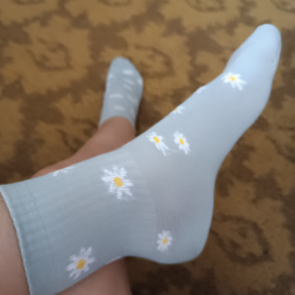 Носочки чудесные и очень комфортные. Средней высоты резинка, не давит совершенно. Принт исключительно милый. Единственное, что маломерят. На свой 38 с половиной купила 25-27 размера, впритык. Предполагается, что носки подойдут на 41 размер, в чем сильно сомневаюсь.