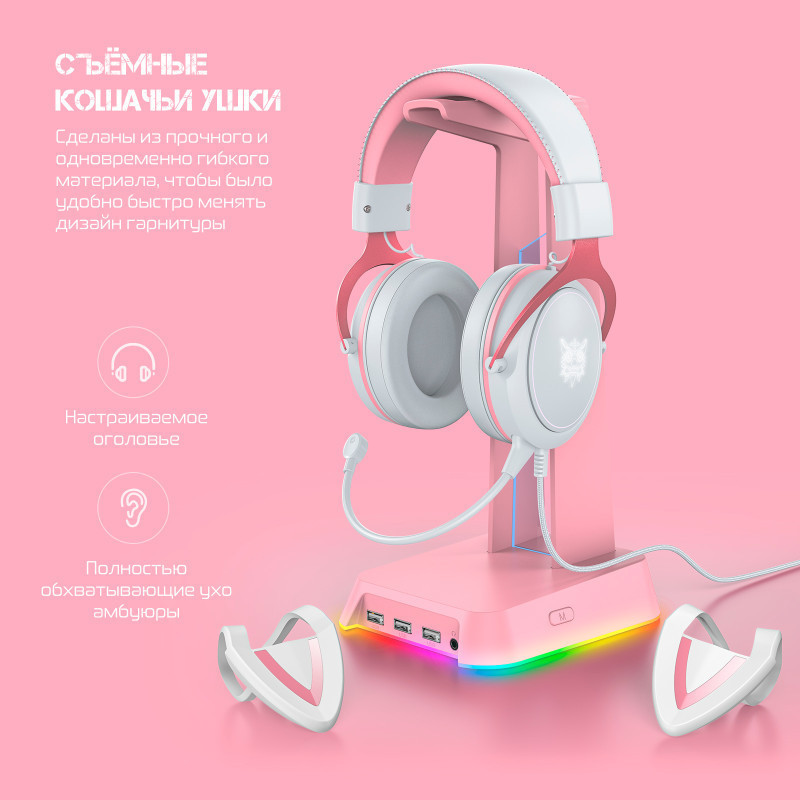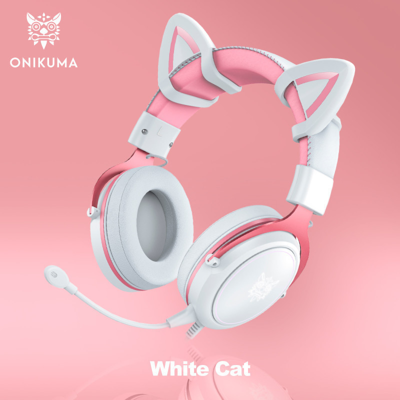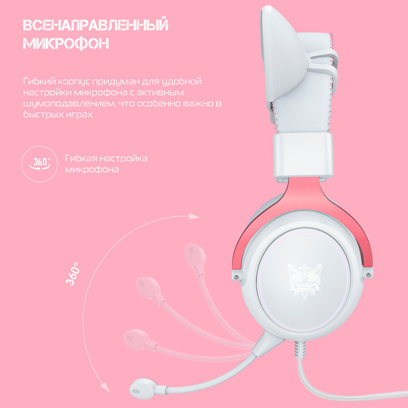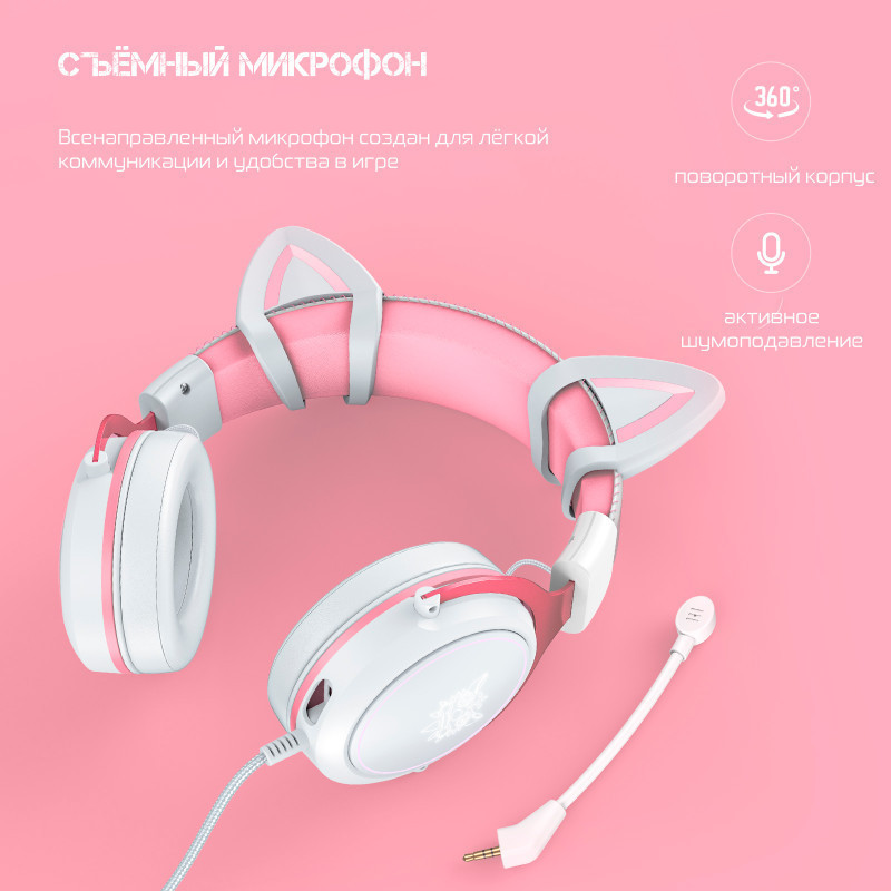 Наушники с ушками ONIKUMA White Cat выполнены в белом цвете. Другая отличительная особенность — наличие яркой RGB-подсветки, которая автоматически включается при подключении игровых наушников к вашему гаджету через USB-штекер. Наушники с подсветкой — это привлекательный атрибут и отличный подарок для геймера.
